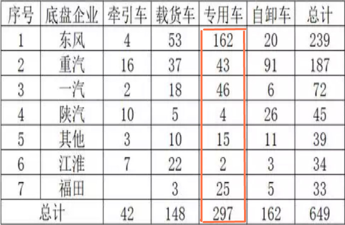 橫向比較幾款整車可以發(fā)現(xiàn),牽引、載貨、自卸大多為主機(jī)廠自己申報(bào),而國六專用車產(chǎn)品多為改裝廠申報(bào),所以是“兵家必爭(zhēng)之地”。