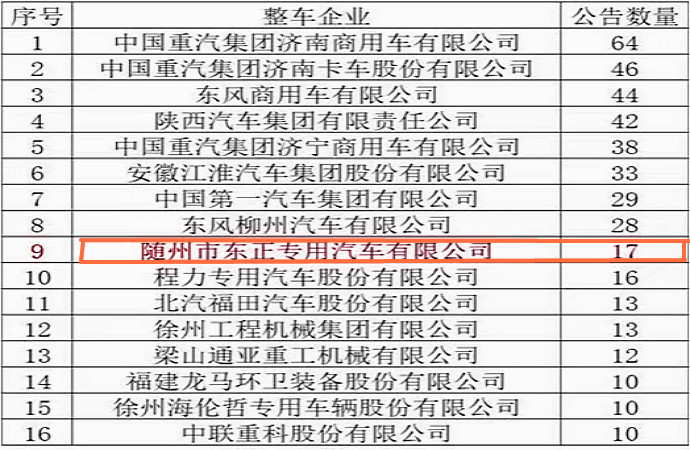 對(duì)于整車公告而言,本批國六重卡公告數(shù)量10個(gè)以上的企業(yè),共計(jì)16家,主機(jī)廠占據(jù)主流,重汽濟(jì)南商用車、重汽濟(jì)南卡車東風(fēng)商用車公司分列前三名。改裝廠中,隨州東正汽車排名靠前。