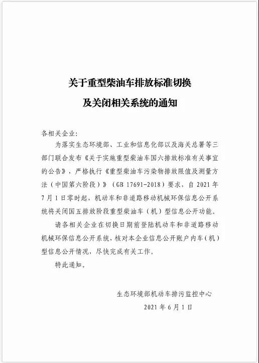 為落實(shí)生態(tài)環(huán)境部、工業(yè)和信息部以及海關(guān)總署等三部門聯(lián)合發(fā)《關(guān)于實(shí)施重型柴油車國六排放標(biāo)準(zhǔn)有關(guān)事宜的公告》,嚴(yán)格執(zhí)行《重型柴油車國六排放標(biāo)準(zhǔn)有關(guān)事宜的公告》,嚴(yán)格執(zhí)行《重型柴油車污染物排放限值及測量方法(中國第六階段)》(GB 17691-2018)要求,自2021年7月1日零時(shí)起,機(jī)動(dòng)車和非道路移動(dòng)機(jī)械環(huán)保信息公開系統(tǒng)將關(guān)閉國五排放階段重型柴油機(jī)車(機(jī))型信息公開功能。