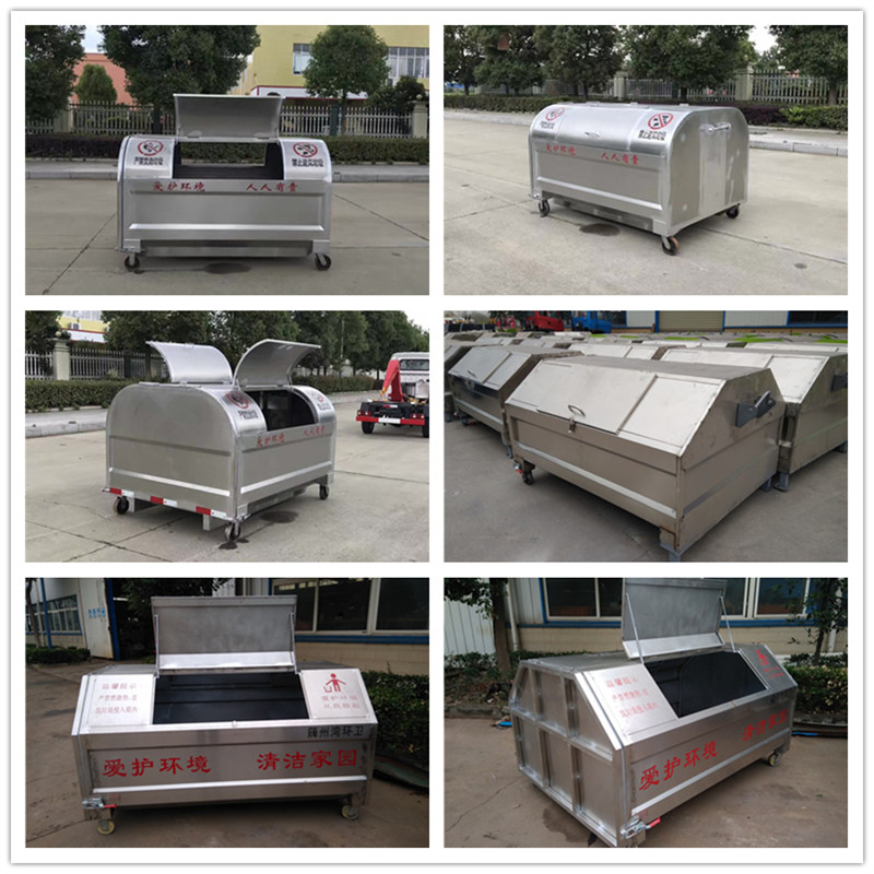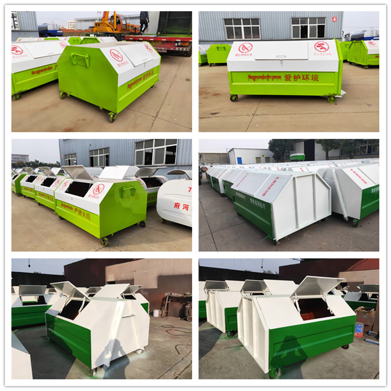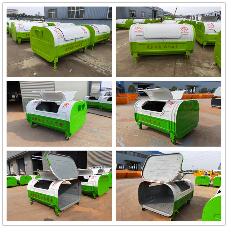 勾臂垃圾車配套移動垃圾箱外形以上梯形下長方形、上弧形下長方形、上弧形下弧形、長方形為主,箱體兩邊各帶一對或二對垃圾投入口或頂部開口,帶蓋式箱體能夠避免風將輕質垃圾(塑料袋,廢紙等)吹散和防止雨水進入箱內;箱體底部帶一對鐵輪方便吊上卸下時垃圾箱的移動,箱體后部可開啟【帶鎖緊機構,配備密封條】。勾臂垃圾箱外觀形狀、大小容積可根據(jù)用戶需求定制加工。