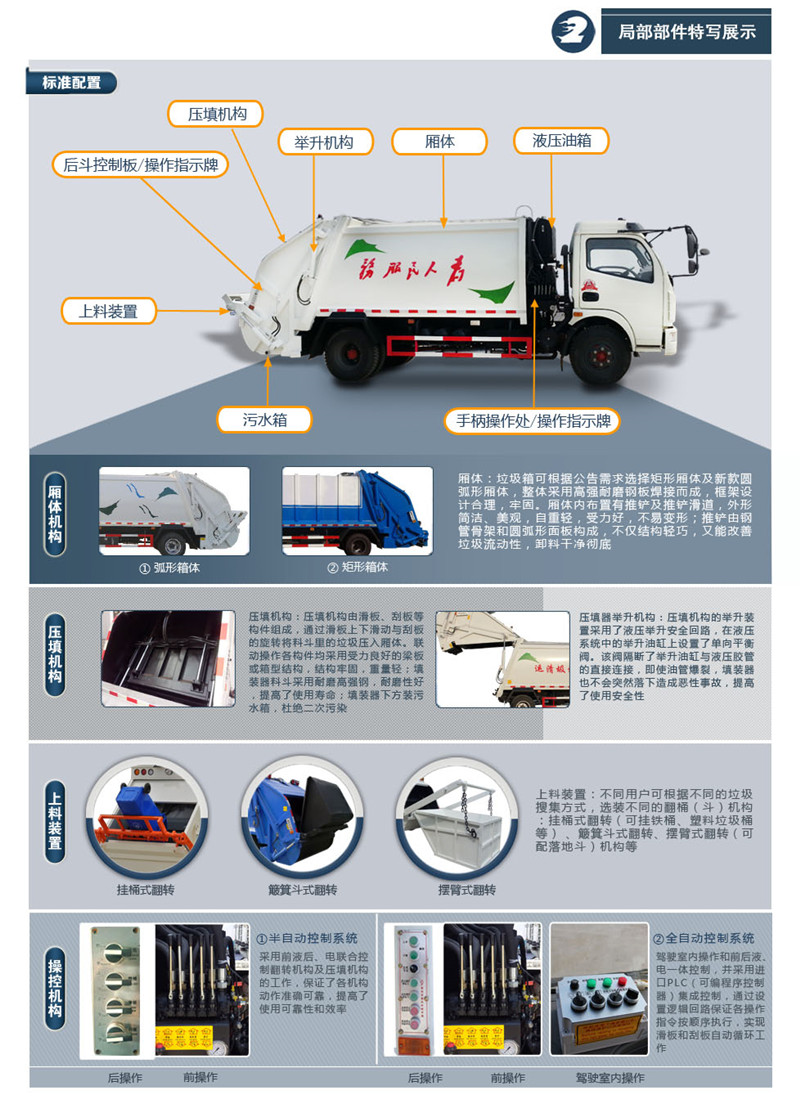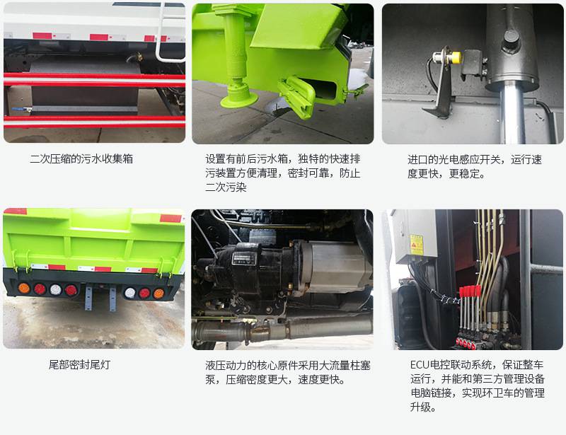 上裝配置:廂體圓弧設(shè)計(增強(qiáng)廂體承受力),Q345錳鋼板(高強(qiáng)度耐磨抗壓材質(zhì),罐體試用壽命更長),前后雙向壓縮,推鏟卸料,長源液壓泵,中梅多路換向閥,維森博樂油缸,高耐壓液壓油管,西門子PLC一鍵操作系統(tǒng)(駕駛室內(nèi)外均可操作),移動遙控器控制箱體操作,雙污水箱(前后各一個),邊燈,高位示廓燈,夜間作業(yè)燈。