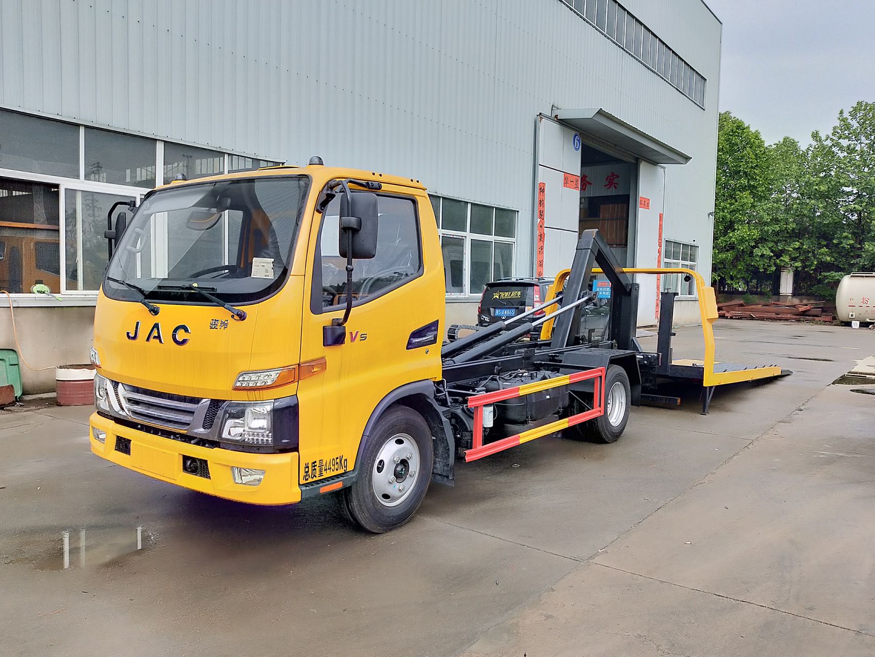 上裝配置:采用沖孔沖壓板或花紋板制成,雙側(cè)聯(lián)動操作裝置,4噸液壓絞盤(25米鋼絲繩),**小車一對,七字抱胎裝置一套,捆綁帶4條,輪胎擋板一對,工具箱一個,后工作燈兩只。