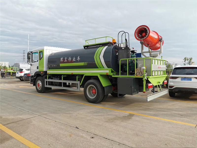 灑水車工作主要由發(fā)動(dòng)機(jī)帶動(dòng)變速箱,變速箱上安裝的取力器帶動(dòng)灑水車水泵產(chǎn)生動(dòng)力,將罐體內(nèi)部的水通過(guò)管路噴灑出去,水泵可自吸自排?筛鶕(jù)用戶需求選配抑塵霧炮。